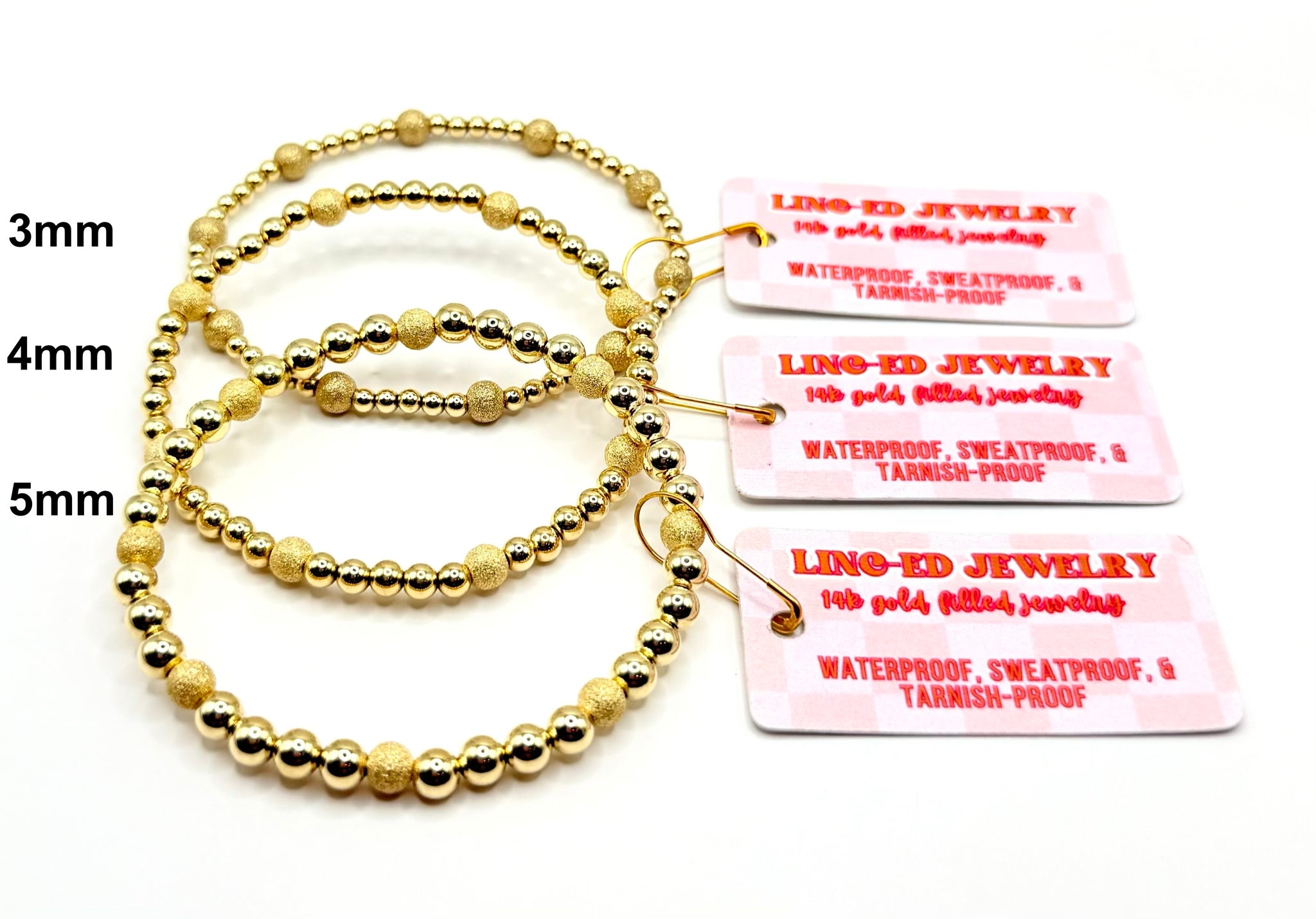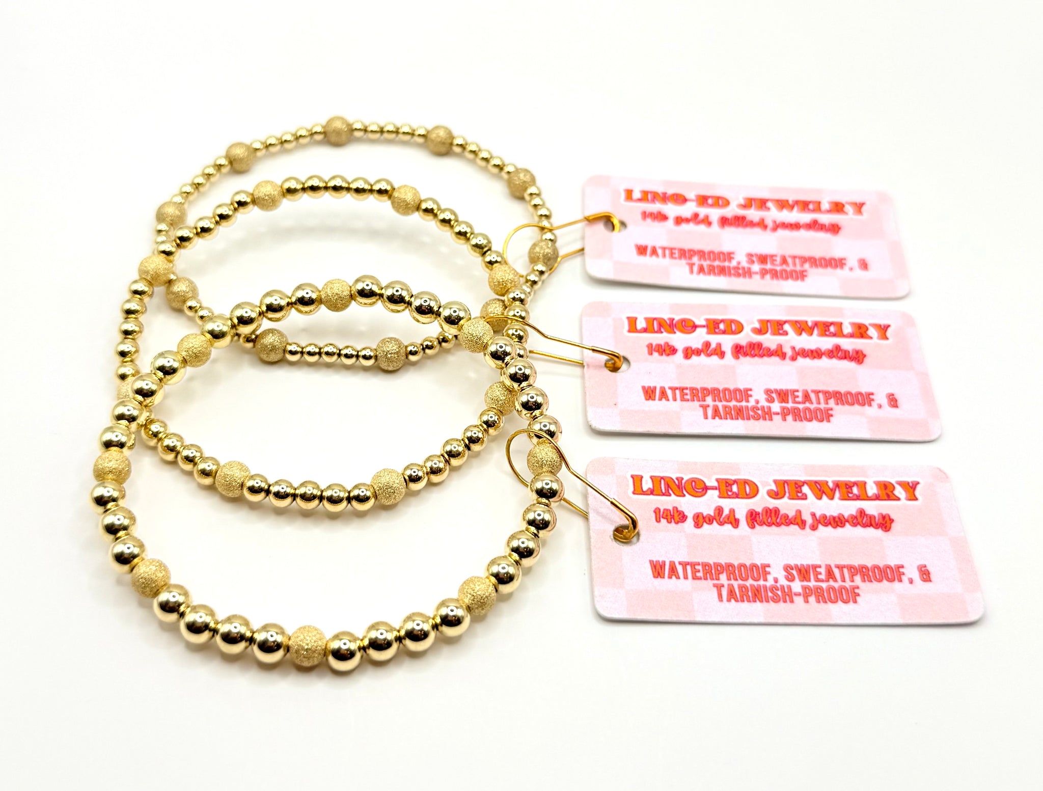 These stunning stretch bracelets are made with a mix of classic high-polish gold-filled beads and stardust-textured gold-filled beads, giving them the perfect combination of shine and subtle sparkle. Available in 3mm, 4mm, and 5mm bead sizes, they offer a versatile style that can be worn solo or stacked for a bolder look.